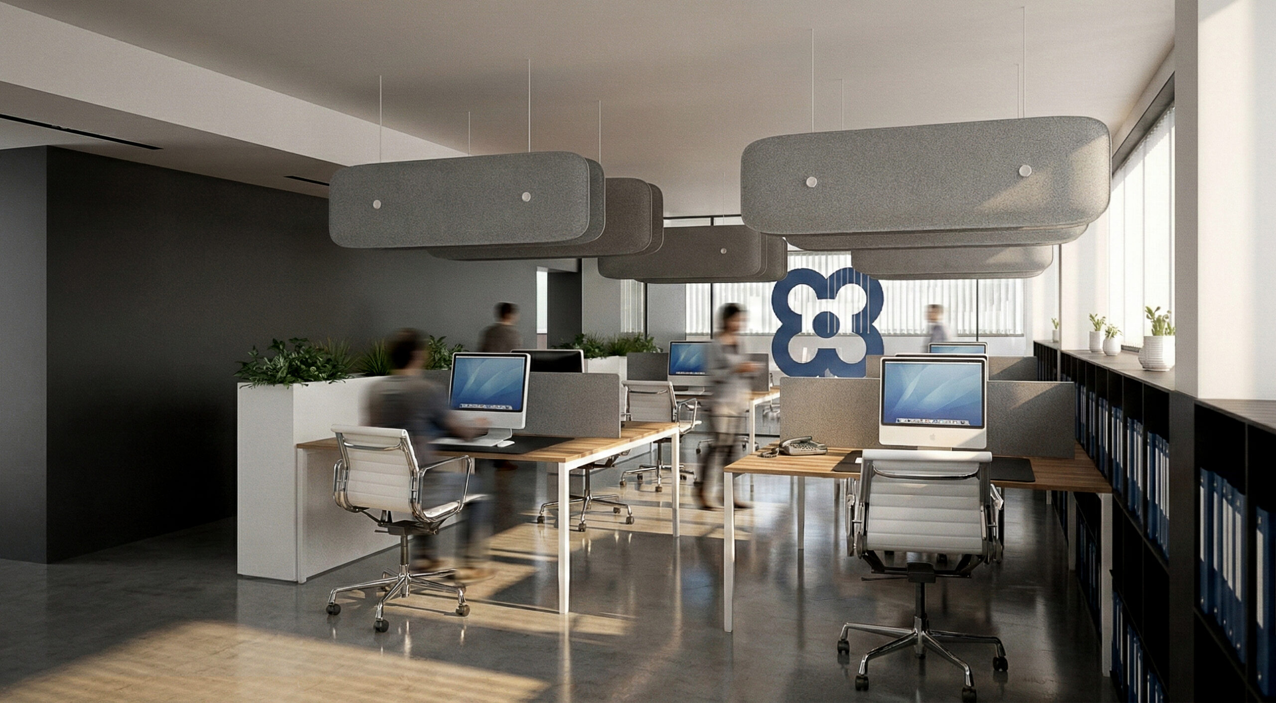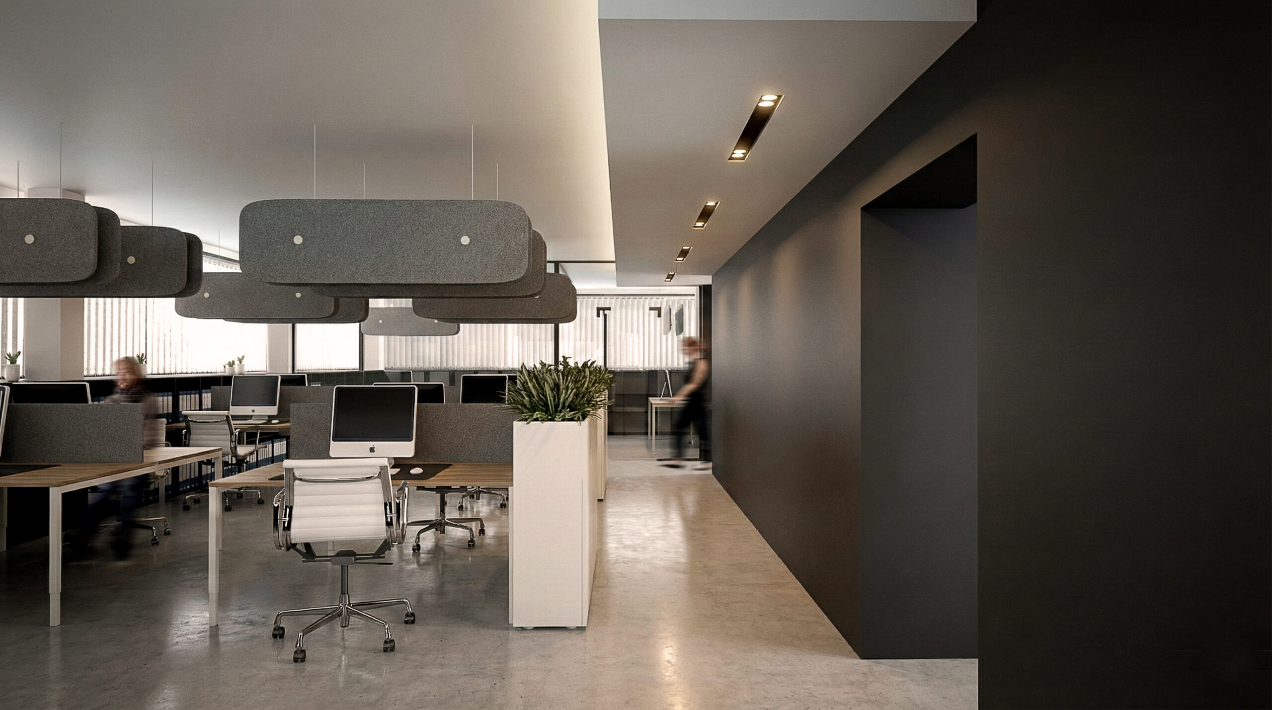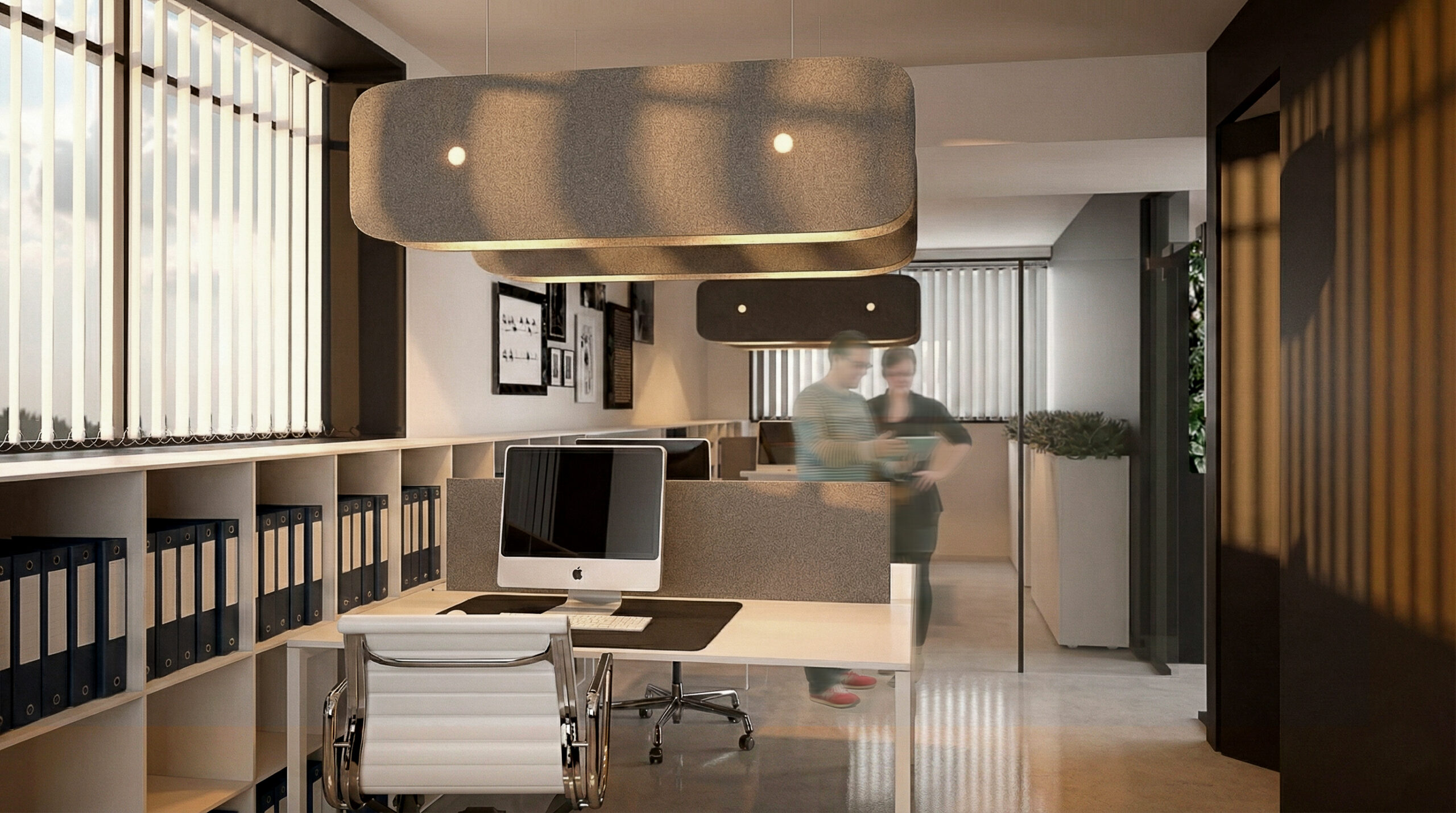 Per la componente acustica e luminosa abbiamo adottato Hush di Martinelli Luce: un sistema fonoassorbente e illuminante da me progettato, integrato con corpi luce puntuali e scenari controllabili. L’operatività si struttura con postazioni bench modulari con gestione cavi, cassettiere e contenitori, pareti attrezzate per archivio e storage, tavoli riunione e zone di confronto rapido; sedute operative ergonomiche e sedute visitatori completano l’assetto, insieme ad alcuni arredi su misura per reception e spazi di rappresentanza.