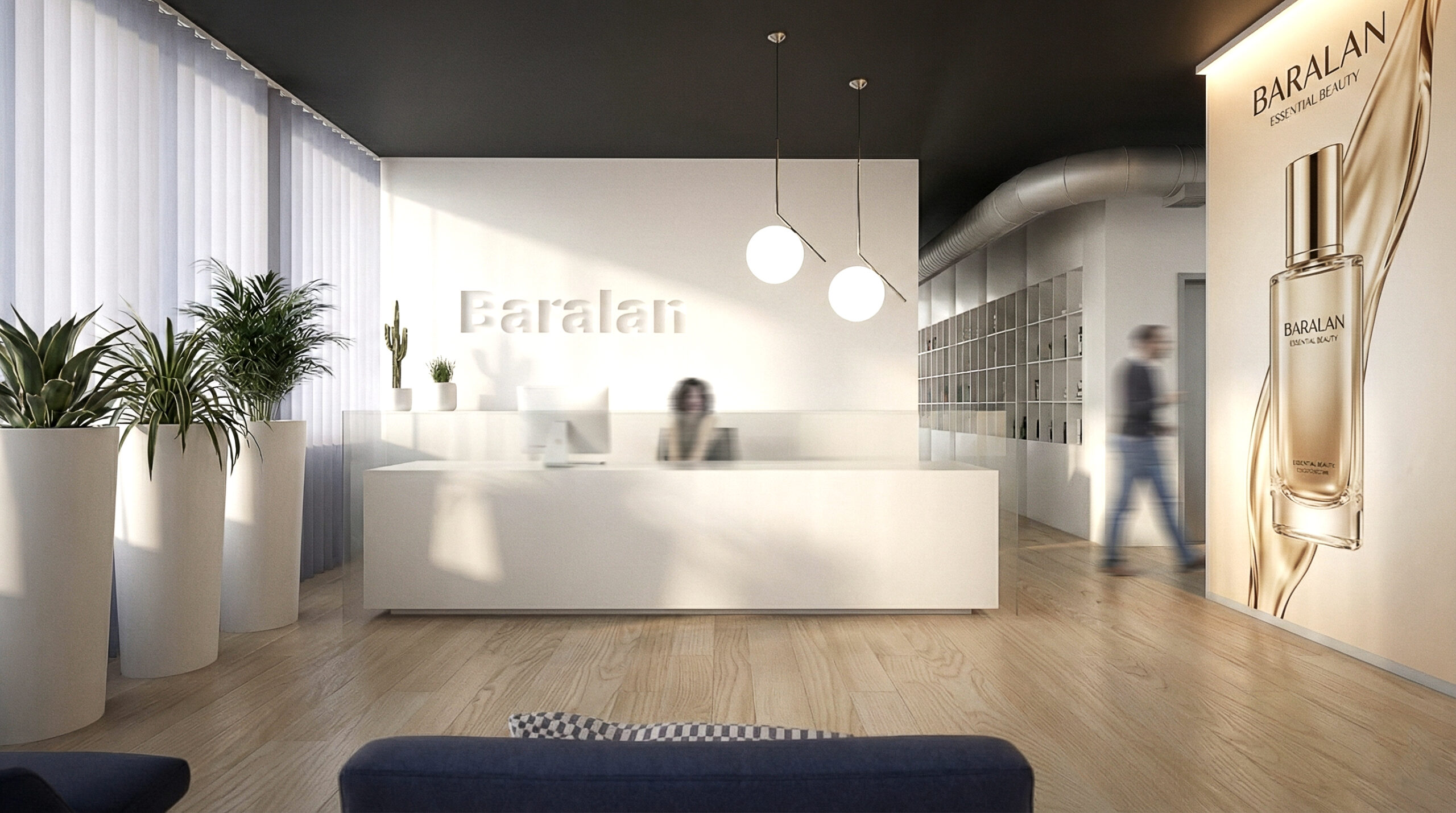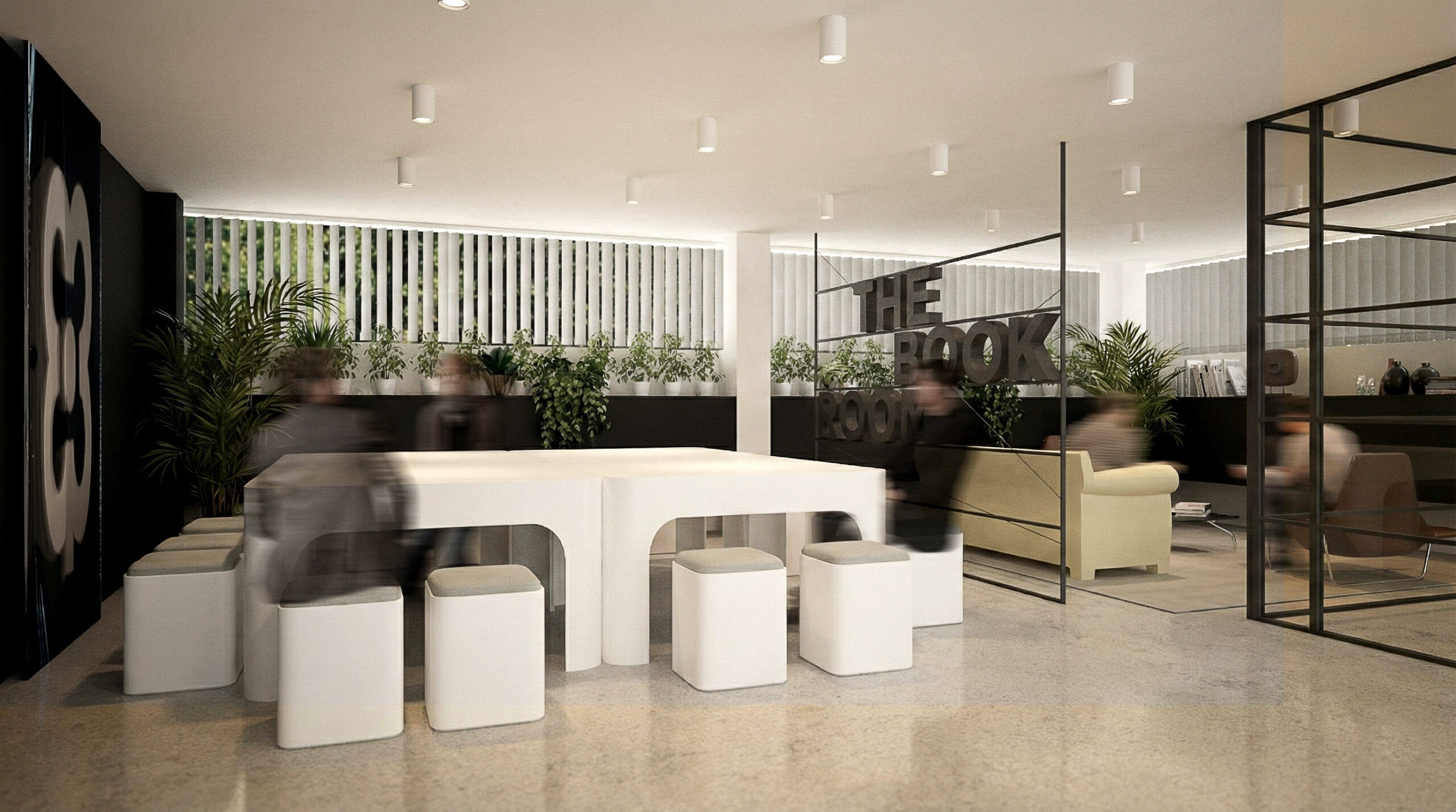 Il progetto si caratterizza per una palette neutra con accenti scuri che definiscono profondità e fondali, affiancata da legno e superfici tecniche per rendere gli spazi più caldi e funzionali. Il vetro con telai sottili garantisce separazioni leggere e continuità visiva, mentre il verde contribuisce al benessere come elemento integrato. Gli arredi su misura, come reception e contenitori, si integrano armoniosamente con componenti standard, bilanciando personalizzazione e razionalità.