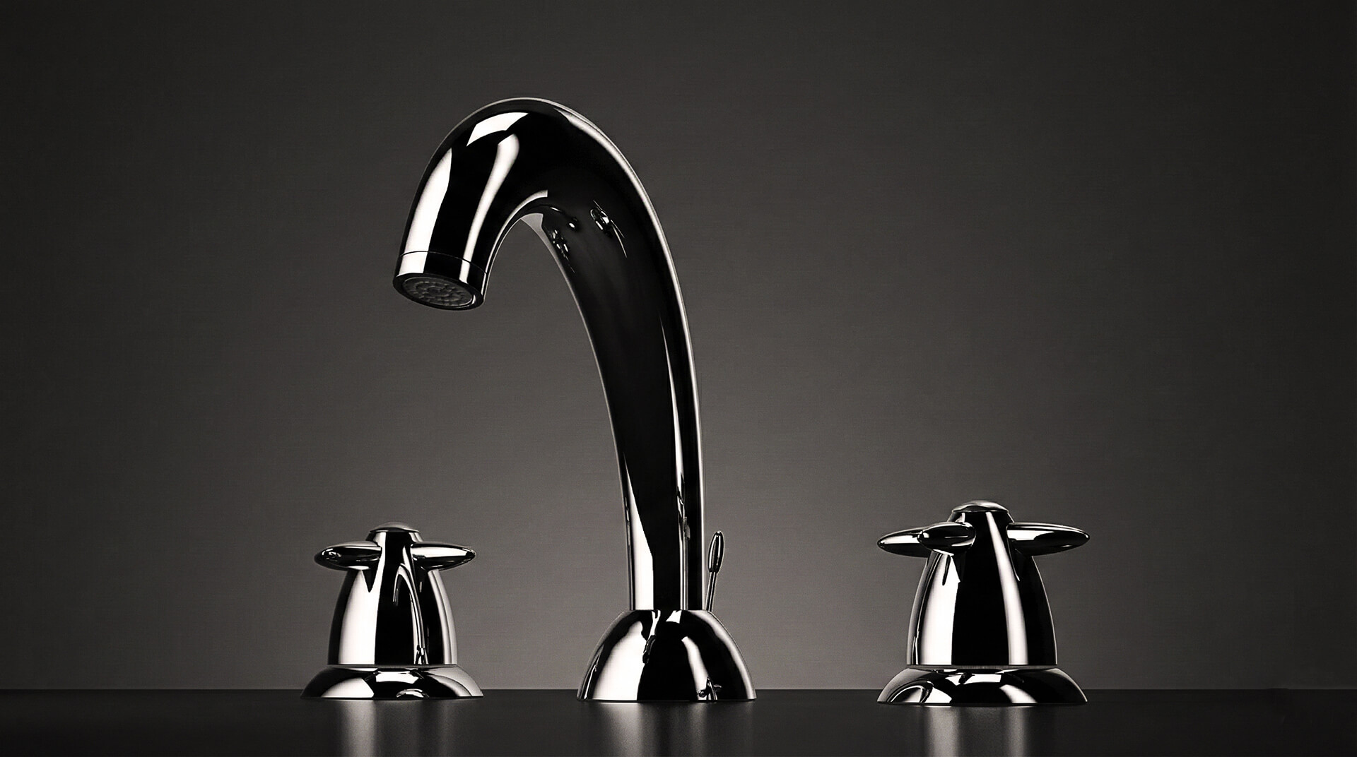 Rubinetteria lavabo Compass, vista frontale su fondo scuro con corpo centrale e due manopole.