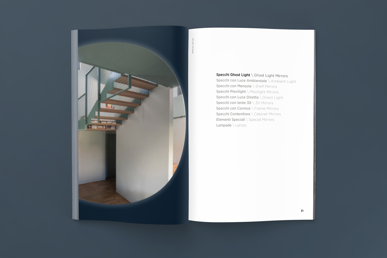 L’incipit di ogni famiglia è scandito da un dispositivo narrativo: il riflesso delle architetture progettate da elasticofarm (Stefano Pujatti). La forma circolare — eco discreta dello specchio — trasforma l’apertura di sezione in una soglia: non decorazione, ma senso. Anche la copertina, con lamina d’argento e specchi concettuali stilizzati, sintetizza il posizionamento: innovazione sobria, precisione e cultura del progetto.