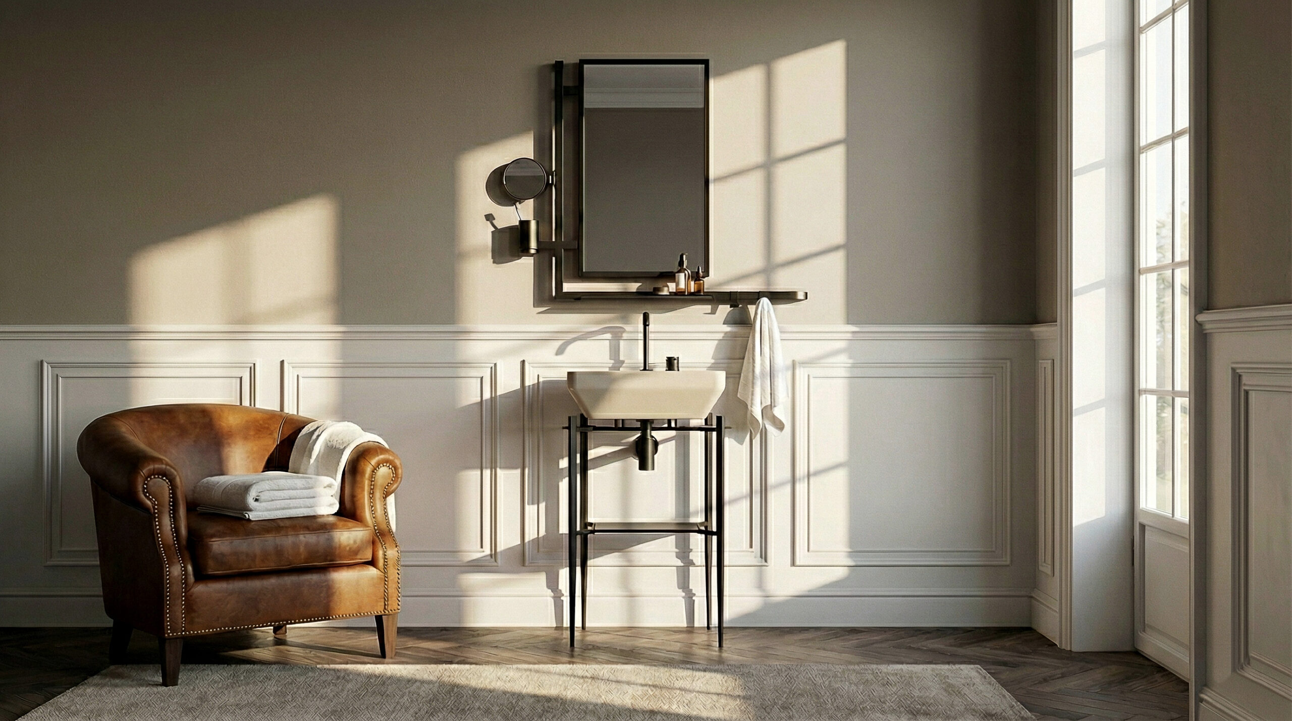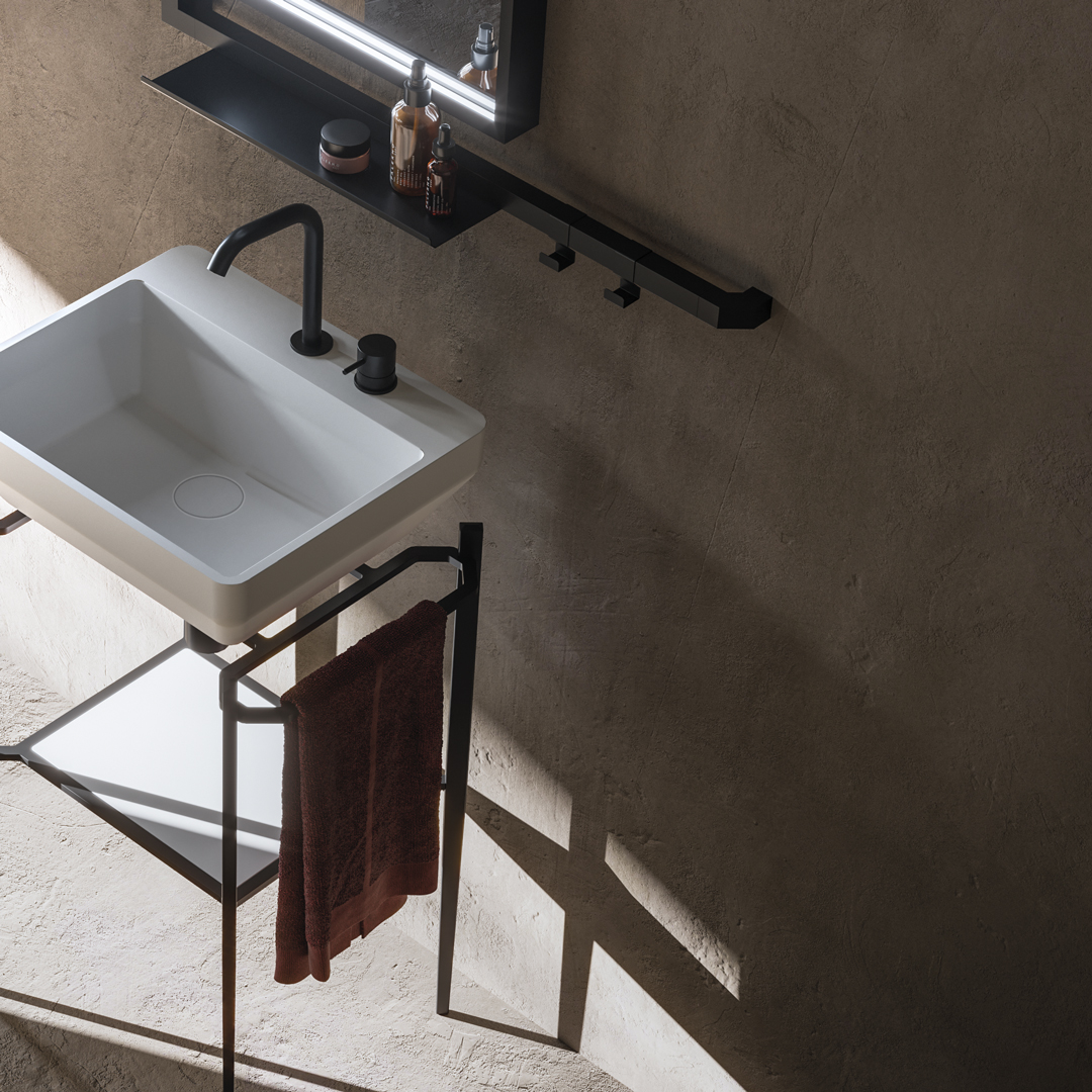 Il nome non deriva dalla barra metallica, ma dal dispositivo che sostiene lo specchio ingranditore: un magnete sferico che consente orientamento, avvicinamento e distacco. È un dettaglio tecnico che diventa libertà: la luce e il riflesso non comandano l’utente, lo seguono. E la tecnologia Ghost rafforza la qualità percettiva dell’insieme: da spento, lo specchio rimane davvero specchio; da acceso, la luce appare solo quando è necessaria.
