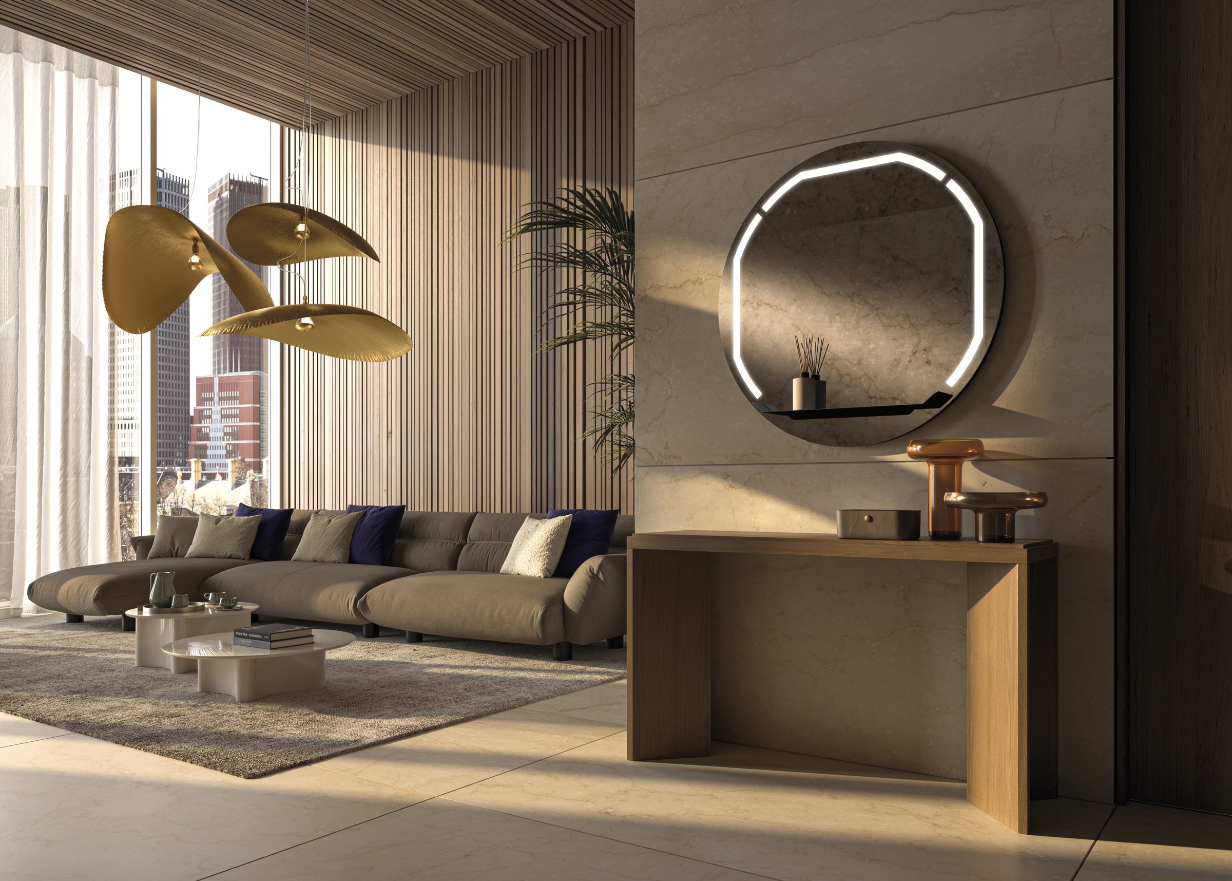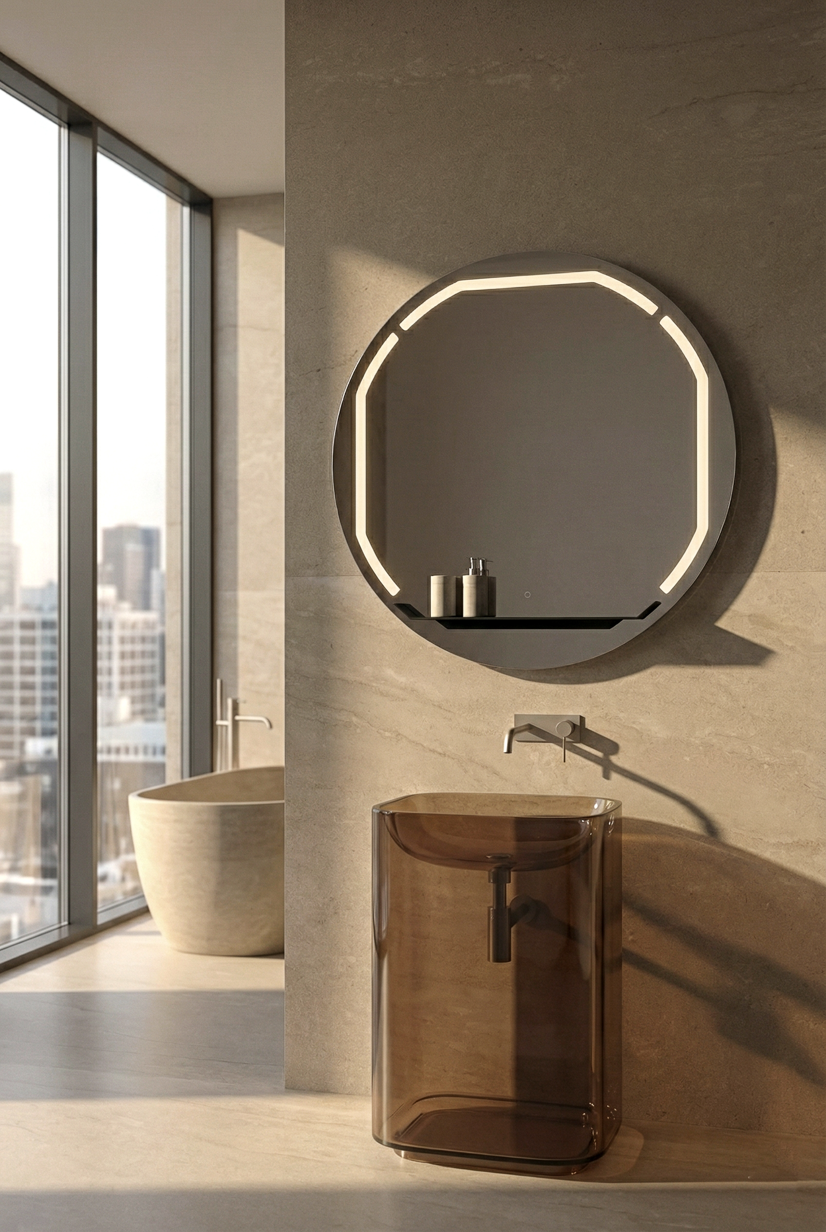 Mirage nasce nel 2021 per Vanità & Casa: uno specchio che interpreta il rettangolo come architettura di luce, trasformando la retroilluminazione in un segno controllato, leggibile, mai ridondante. La serie si estende poi alle versioni tonda e ovale, dove una mensola metallica entra nel disegno e dialoga con i settori luminosi Ghost, attivabili anche separatamente. A specchio spento, la luce resta invisibile: nessuna velatura, nessuna “presenza lattea” sulla superficie.