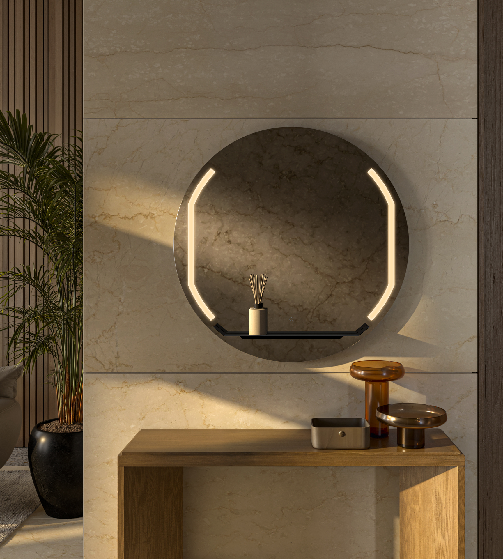 Il progetto vive nell’equilibrio tra precisione e facilità d’uso. L’accensione per settori e la regolazione dell’intensità consentono di passare dalla funzione (trucco, rasatura, cura del viso) a un’atmosfera misurata, costruita per sottrazione. Nei dettagli, Mirage risolve ciò che spesso resta irrisolto: tra mensola e vetro, una guarnizione in silicone genera un micro-distacco di 0,5 mm che evita zone critiche e rende la pulizia semplice, quotidiana, naturale. Mirage attraversa gli ambiti — bagno, living, hospitality — mantenendo un’identità sobria, dove luce e superficie restano sempre al servizio del gesto.